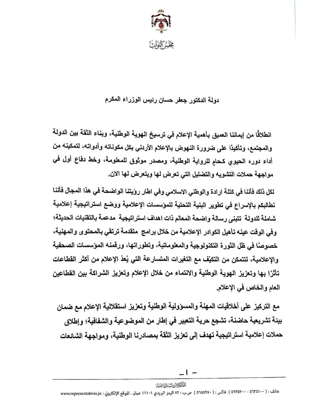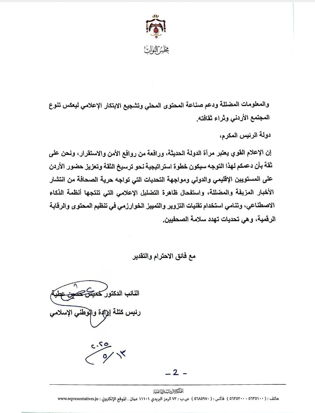 إن الإعلام القوي يعتبر مرآة الدولة الحديثة، ورافعة من روافع الأمن والاستقرار، ونحن على ثقة بأن دعمكم لهذا التوجه سيكون خطوة استراتيجية نحو ترسيخ الثقة وتعزيز حضور الأردن على المستويين الإقليمي والدولي ومواجهة التحديات التي تواجه حرية الصحافة من انتشار الأخبار المزيفة والمضللة، واستفحال ظاهرة التضليل الإعلامي التي تنتجها أنظمة الذكاء الاصطناعي، وتنامي استخدام تقنيات التزوير والتمييز الخوارزمي في تنظيم المحتوى والرقابة الرقمية، وهي تحديات تهدد سلامة الصحفيين