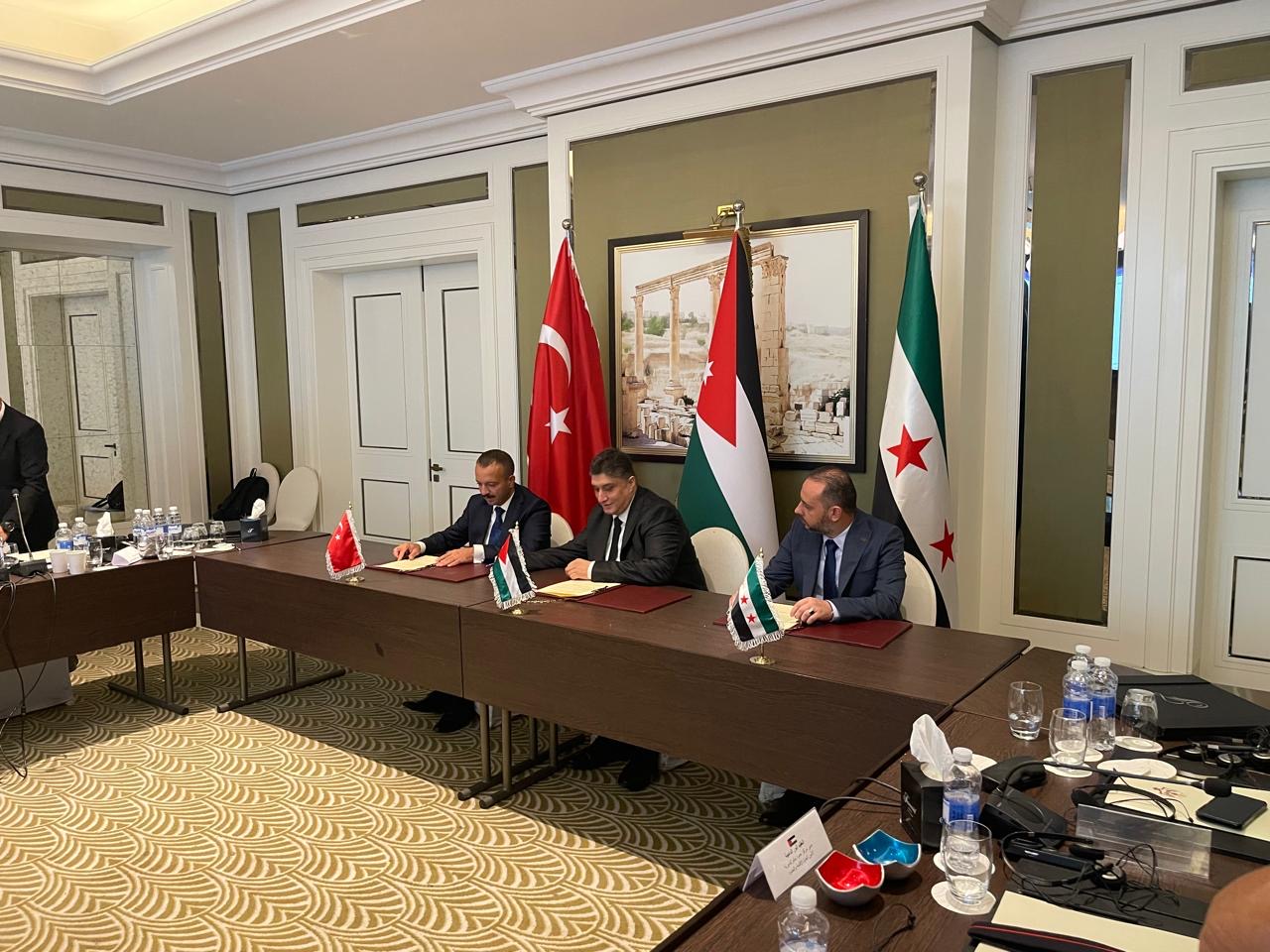 وتم في ختام الاجتماع توقيع محضر مشترك سيرفع الى وزراء النقل في الدول الثلاث، وتضمن مقترحات رئيسية من بينها تفعيل اللجان الفنية لانماط النقل البري والبحري والسككي والجوي، وفتح معبر باب الهواء – جيلواغوز امام الشاحنات الاردنية عبر سوريا بعد استكمال الشروط الفنية، وتفعيل الخط الحديدي الحجازي من خلال تقديم تركيا دعما لسوريا لاعادة ترميمه، وتقديم الاردن دعما فنيا يتمثل بصيانة القاطرات السورية، اضافة الى التعاون الثلاثي لاعداد دراسات فنية لانشاء خط سككي بمواصفات عالمية يربط الدول الثلاث بشبكات التجارة العالمية، الى جانب بحث امكانية تعزيز خط الشاحنات من ميناء العقبة باتجاه تركيا واوروبا الشرقية عبر اتفاقيات تعاون مشترك.