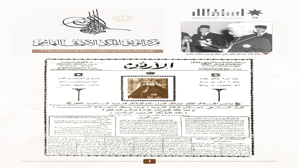 اَفاق نيوز – أصدر مركز التوثيق الملكي الأردني الهاشمي بمناسبة الذكرى التاسعة والسبعين لاستقلال المملكة، نشرة توثيقية خاصة تستعرض أبرز المحطات والأحداث الوطنية التي رافقت هذا الحدث التاريخي الخالد.