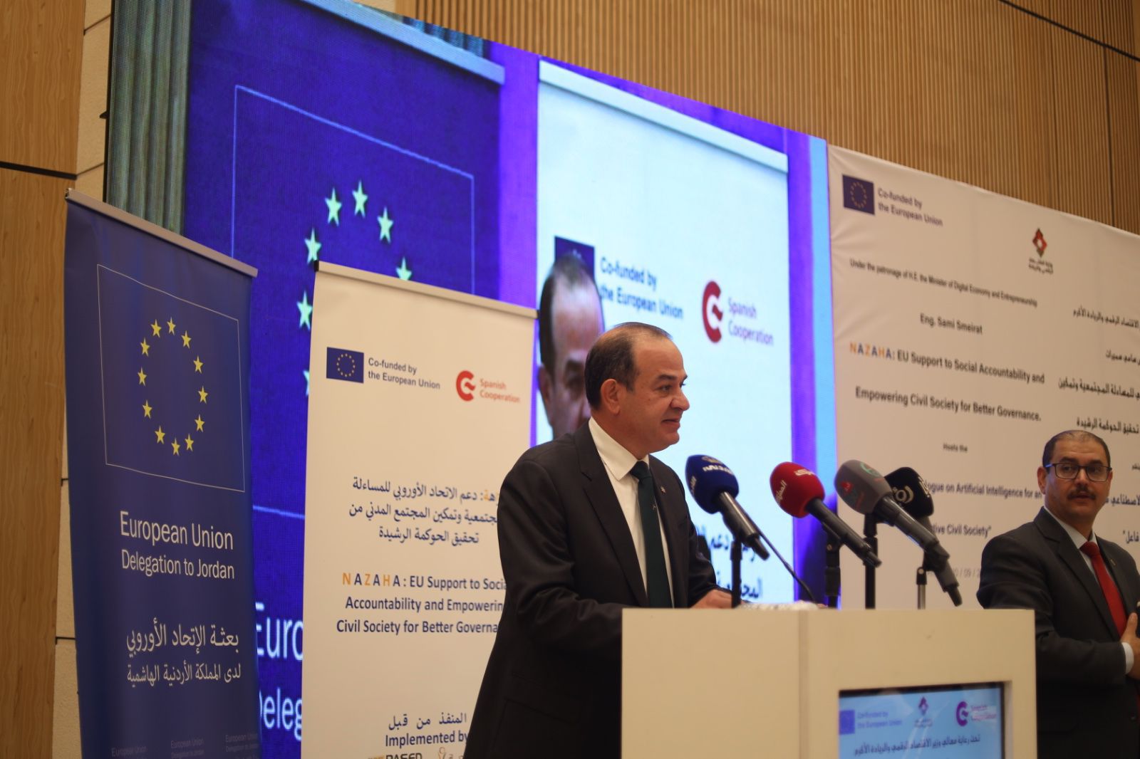 افتتح وزير الاقتصاد الرقمي والريادة المهندس سامي المسيرات فعاليات “المؤتمر الوطني للذكاء الاصطناعي من أجل مجتمع مدني فاعل”، الذي نظمه مركز الحياة راصد في إطار مشروع “نزاهة: دعم الاتحاد الأوروبي للمساءلة المجتمعية وتمكين المجتمع المدني من تحقيق الحوكمة الرشيدة”، والممول تمويل مشترك من قبل الإتحاد الأوروبي والوكالة الإسبانية للتعاون الدولي من أجل التنمية(AECID)، والمُنفذ من قبل مركز الحياة – راصد ومنظمة رشيد للشفافية الدولية. بحضور ملحق بعثة الاتحاد الأوروبي لدى الأردن ا حنينا بن برنو، ونائب رئيس بعثة سفارة اسبانيا لدى الأردن، استيباليز لوبيز دي غويكوتشيا، وعدد من النواب، وممثلي الوزارات والمؤسسات الرسمية، وطيف واسع من ممثلي مؤسسات المجتمع المدني والمحلي من كافة المحافظات، والمؤسسات الدولية، وأكاديميين وشركات من القطاع الخاص، وحشد من مختلف أصحاب المصلحة المعنية لمناقشة سبل بناء إطار وطني أخلاقي وشفاف وتشاركي لحوكمة الذكاء الاصطناعي في الأردن.