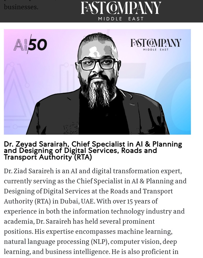 افاق نيوز – صَنفت المجلة الأمريكية Fast Company Magazine بنسختها المخصصة للشرق الأوسط الدكتور زياد الصرايرة ضمن 50 شخصية من قادة طليعة مستقبل يعتمد على الذكاء الاصطناعي في الشرق الأوسط وذلك بعد حصول الصرايرة على العديد من الجوائز خلال عمله في الذكاء الاصطناعي في هيئة الطرق والمواصلات في دولة الأمارت في أمارة دبي تحديداً ، كما أنه يصنف ضمن أبرز خبراء الذكاء الاصطناعي العرب في عام 2022 في مجلة MIT Technology Review والتي تصدر من معهد Massachusetts Institute of Technology والذي يعتبر أفضل جهة أكاديمية على مستوى العالم في مجال التكنولوجيا وقد نشرت اليوم المجلة الأمريكية Fast Company Magazine السيرة الذاتية للدكتور الصرايرة بعد اختياره ضمن 50 شخصية وقد جاء في نص السيرة على موقعها الالكتروني تالياً :