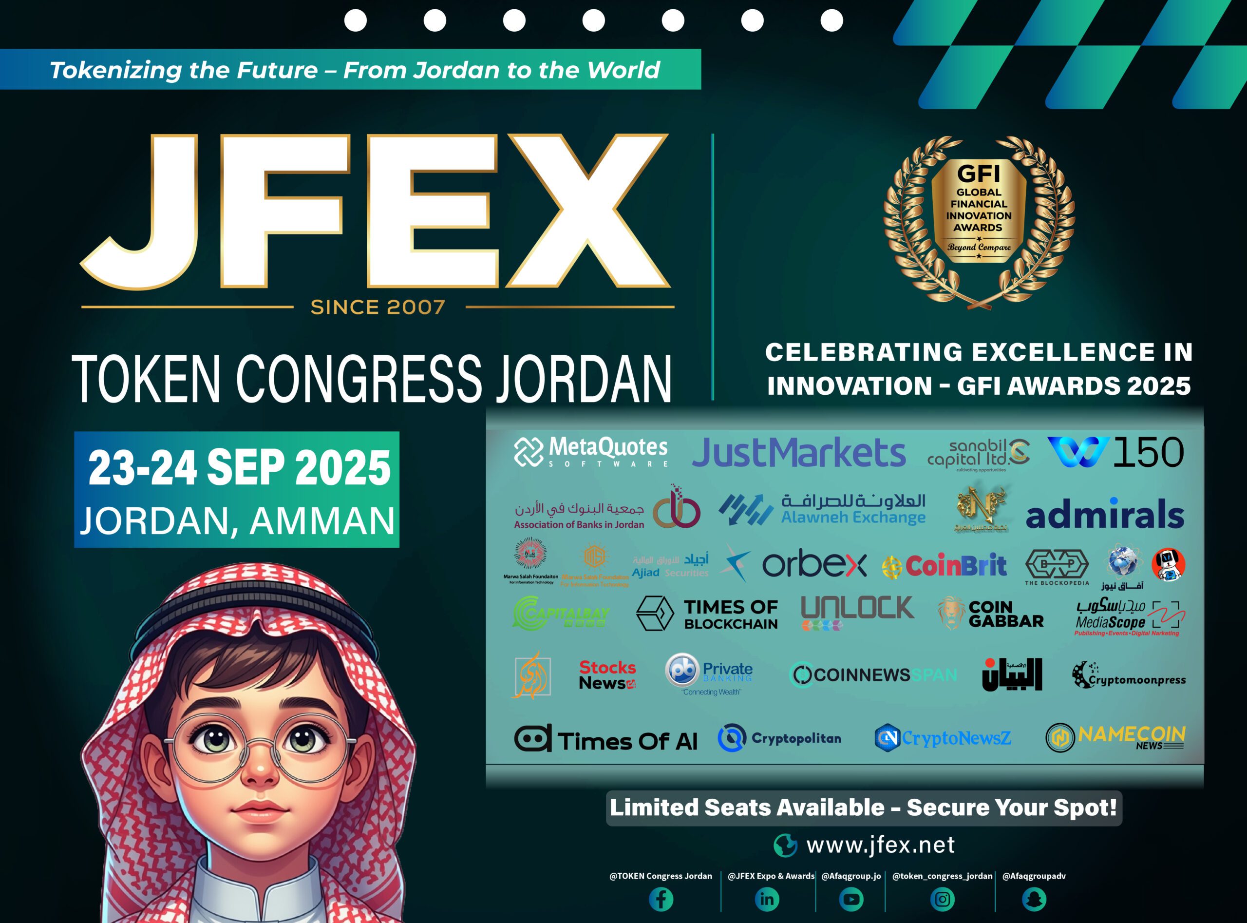 تستعد العاصمة الأردنية عمان لاستضافة مؤتمر Token Congress Jordan 2025 يومي 23 و24 سبتمبر في فندق موفنبيك عمان، بتنظيم من مجموعة آفاق، وبمشاركة واسعة من نخبة الخبراء العالميين والإقليميين، وصناع القرار، وممثلي الجهات التنظيمية والشركات الكبرى العاملة في مجال التكنولوجيا المالية والأصول الرقمية.