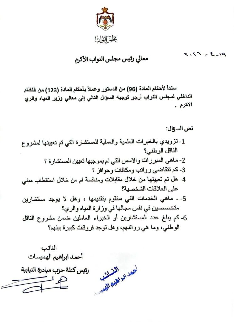 اَفاق نيوز – وجه النائب احمد هميسات أسئلة لوزير المياه والري، حول أسس تعيين مستشارة في مشروع الناقل الوطني.