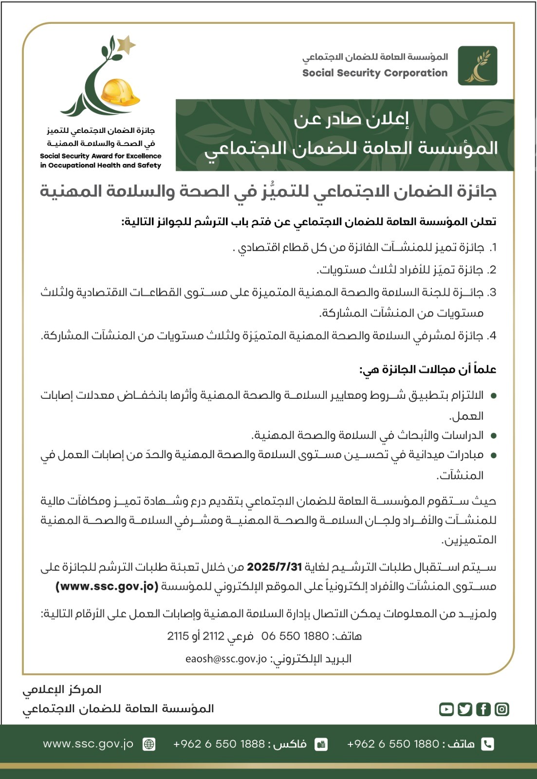 أعلنت المؤسسة العامة للضمان الاجتماعي في بيان صحفي صادر عن مركزها الإعلامي عن بدء استقبال طلبات الترشح لجائزة الضمان الاجتماعي للتميّز في الصحة والسلامة المهنيّة لدورة 2024/2025 على مستوى المنشآت والأفراد.