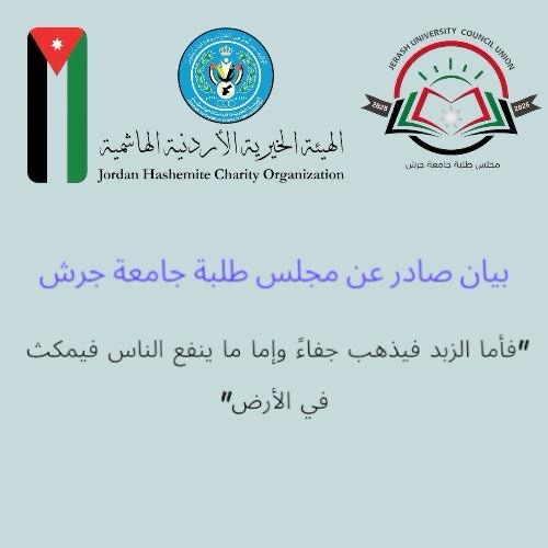 نؤكد على موقفنا الثابت في دعم الجهود الإنسانية والإغاثية، ونعلن أننا كـ مجلس طلبة جامعة جرش سنقف دائماً مع الحق ومع كل ما ينفع الناس، وسنتخذ كافة الإجراءات اللازمة لملاحقة أي جهة تسعى لنشر الأكاذيب والافتراءات.