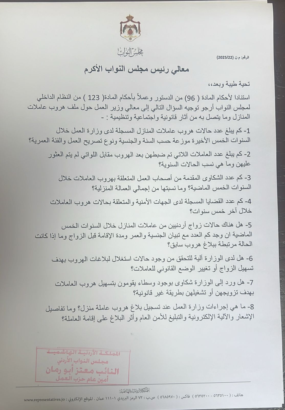 وجه النائب معتز أبو رمان سؤال نيابي إلى وزير العمل تضمن 17 بند حول ظاهرة هروب عاملات المنازل وما تحمله من تبعات قانونية وأمنية واقتصادية فيما ركز بشكل خاص على تزايد حالات زواج شباب أردنيين من عاملات منازل آسيويات هاربات محذراً من تحولها إلى مسار يستغل الثغرات القانونية ويغذي نشاط وسطاء وسوق سوداء آخذة بالاتساع.