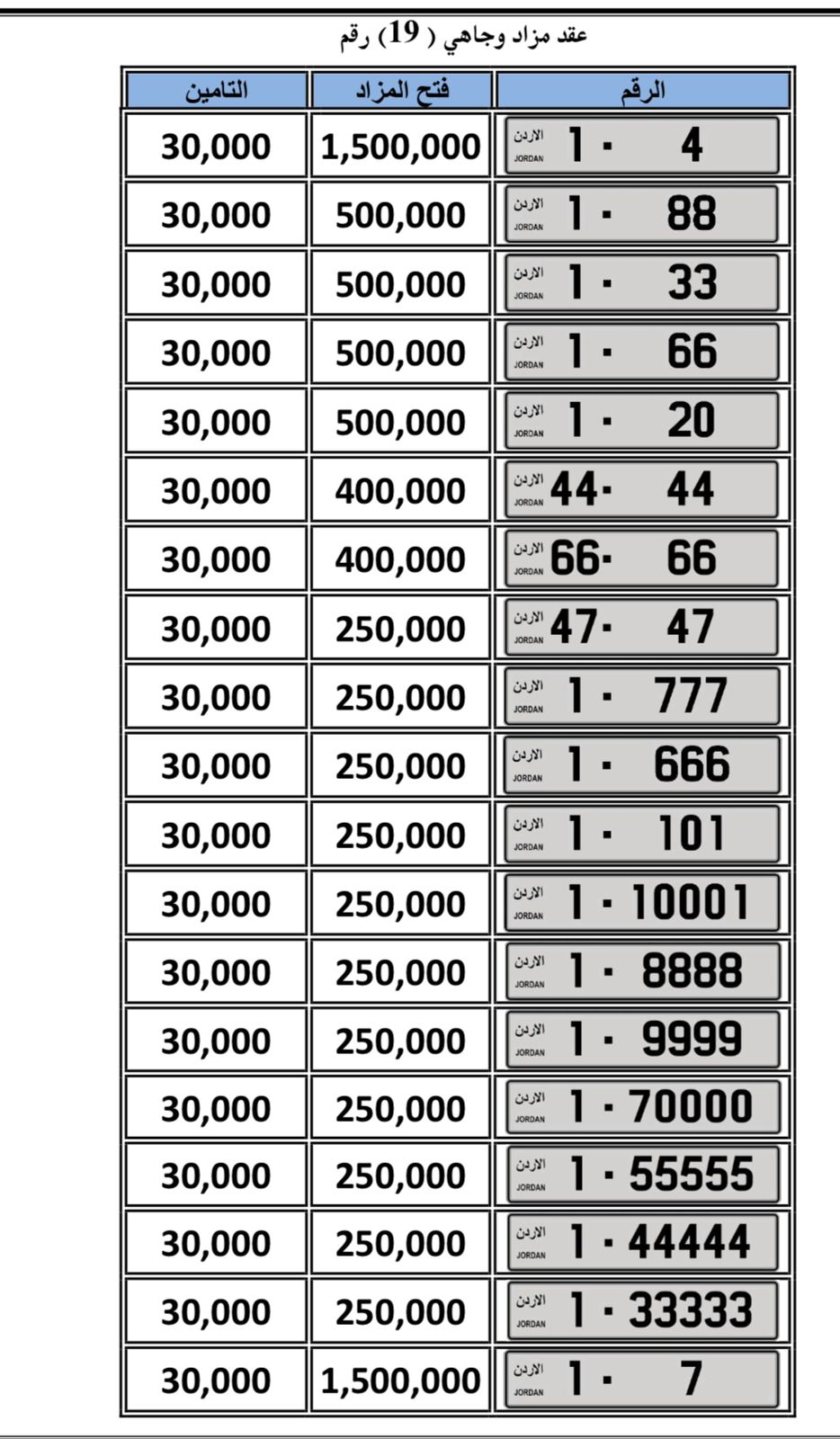 كما وقررت تعديل افتتاح المزاد ليصبح 1،5 مليون للأرقام الأحادية و 500 ألف دينار للأرقام الثنائية بحد أعلى و 250 ألف دينار لباقي الأرقام مع إبقاء السعر المستهدف للأرقام الأحادية على 3 ملايين دينار، وللجنة الحق والصلاحية في الإحالة لأعلى مزايد.