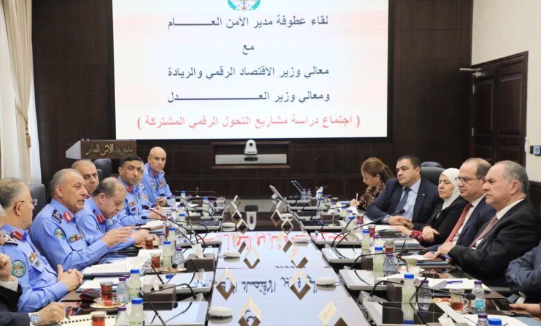 عُقد في مديرية الأمن العام، اليوم الإثنين، اجتماعاً مشتركاً لبحث تسريع مشاريع التحول الرقمي بين وزارتي العدل والاقتصاد الرقمي والريادة ومديرية الأمن العام،