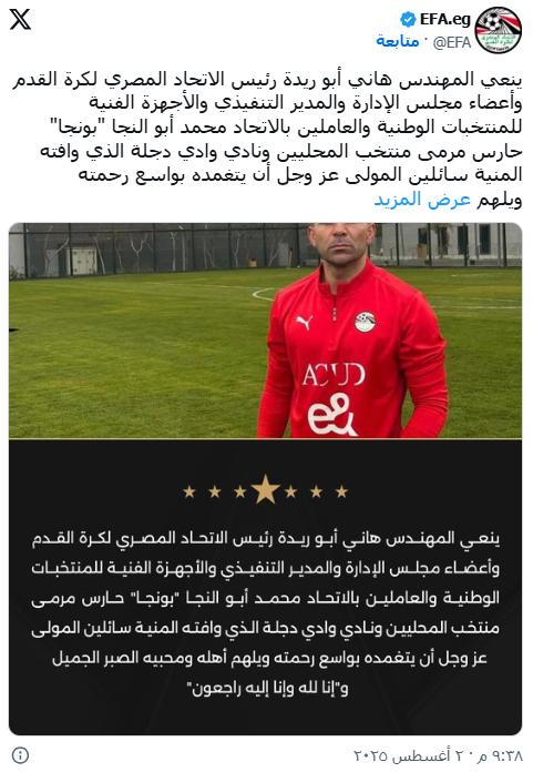وقال الاتحاد المصري لكرة القدم عبر حسابه على منصة “X”: “ينعي المهندس هاني أبو ريدة رئيس الاتحاد المصري وأعضاء مجلس الإدارة والمدير التنفيذي والأجهزة الفنية للمنتخبات الوطنية والعاملين بالاتحاد حارس مرمى منتخب المحليين ونادي وادي دجلة، محمد أبو النجا، الذي وافته المنية..”.